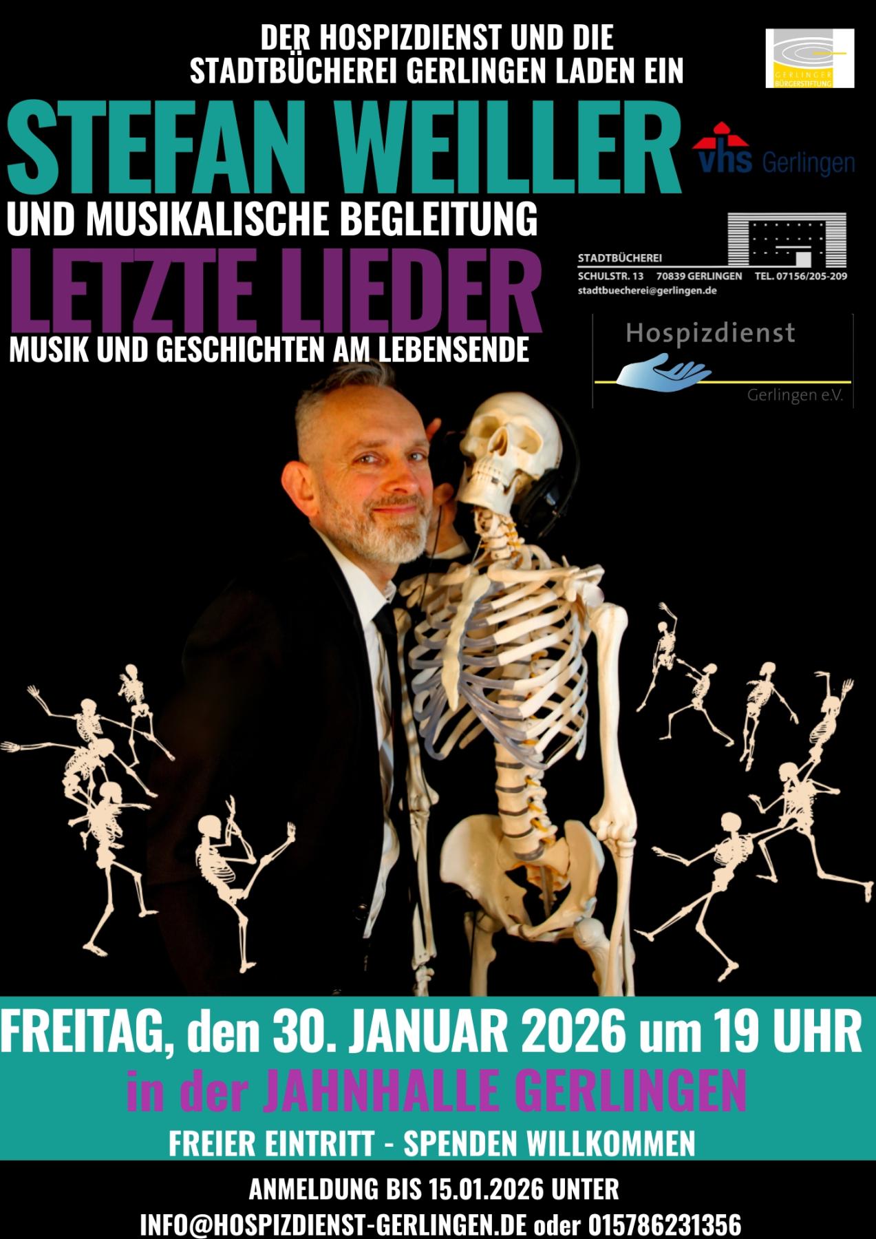 Der Hospizdienst Gerlingen e.V. feiert 2026 sein fünfjähriges Jubiläum. Zum Auftakt hat der als gemeinnützig anerkannte Verein in Kooperation mit der Stadtbücherei Gerlingen einen Liederabend mit Stefan Weiller organisiert. Es geht um Einsichten und Musikgeschichten zum Lebensende.